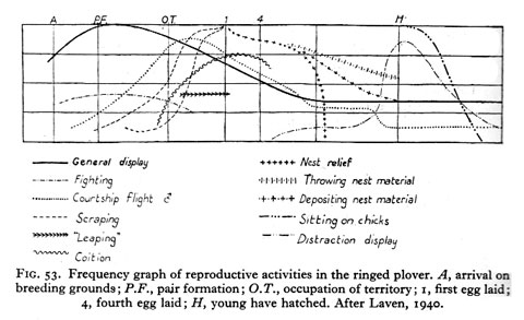 Net binnen via de post: een originele uitgave van The Study of Instinct (Clarendon Press/Oxford University Press, 1951), hét boek waarmee Niko Tinbergen zijn naam zou vestigen als autoriteit op het gebied van diergedrag. Ik heb er nog niets van gelezen (hierover later meer), maar het eerste dat opvalt is het grote aantal prachtige illustraties die er in staan, veelal vergezeld van grafieken die de statistische data inzichtelijk moesten maken. Dit moet in die tijd bij velen een nieuwe wereld hebben geopend, waarin het ‘objectivistisch’ bestuderen van gedrag bij dieren centraal zou staan (al lijkt onderstaande afbeelding daarvan geen voorbeeld?). Enkele andere voorbeelden na de klik.